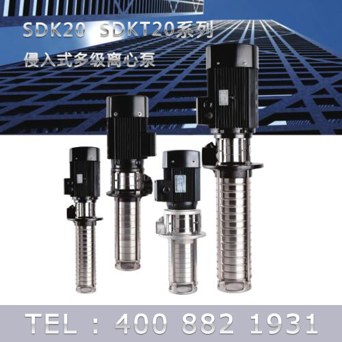 SDK20/SDKT20為配用標準電機的非自吸立式多級離心泵,電機軸和泵軸用聯(lián)軸器直接聯(lián)接的結(jié)構(gòu)。為滿足水槽或容器的安裝深度,可安裝空套的腔體來改變泵本身的侵入 深度。